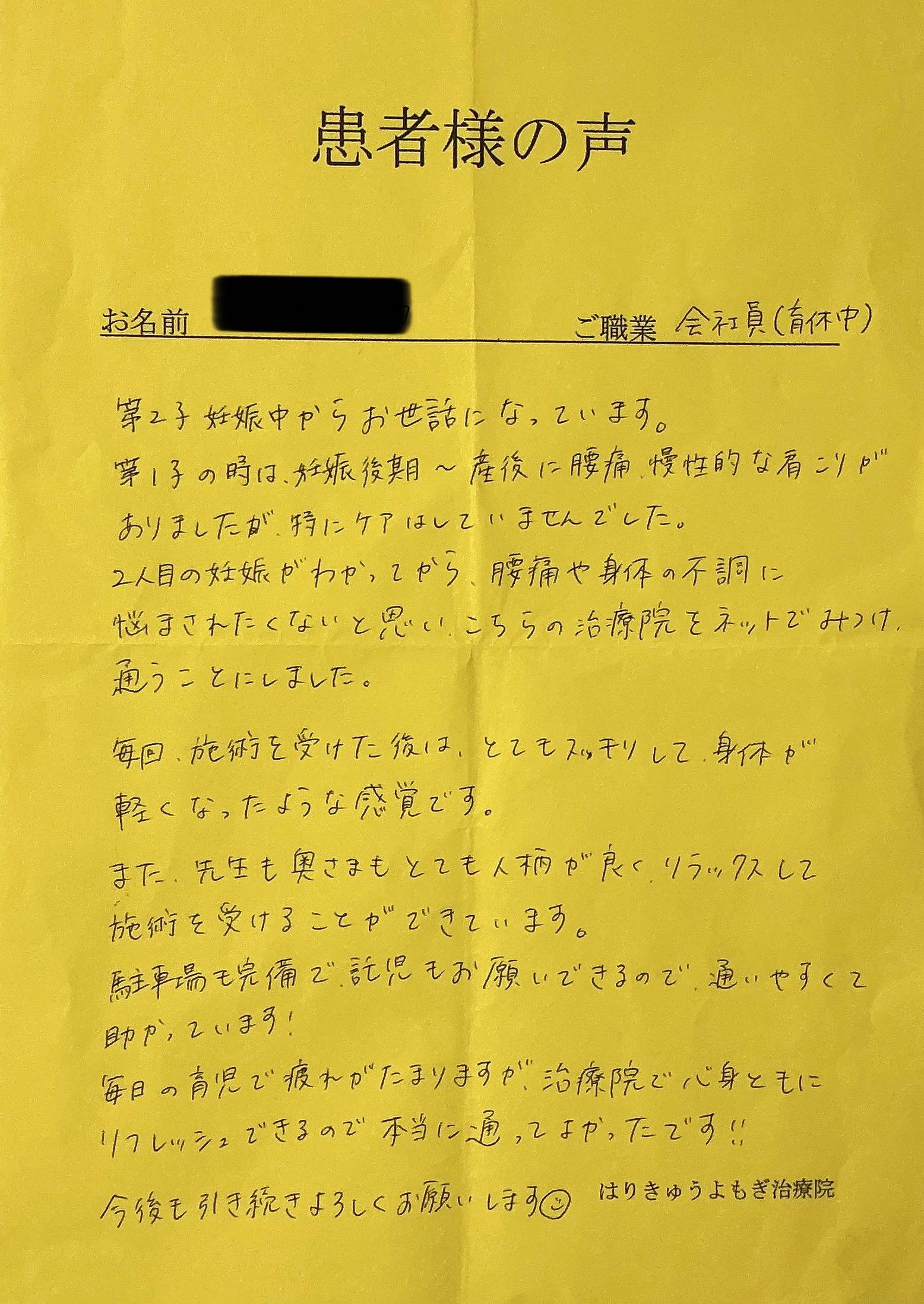2人目の妊娠がわかってから、腰痛や身体の不調に悩まされたくないと思い、こちらの治療院をネットでみつけ通うことにしました。