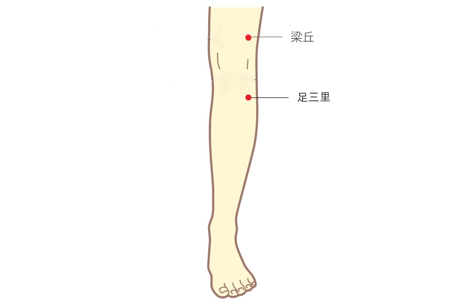 「梁丘」には、本当は鍼やお灸が良いのですがご自身の指で指圧も良いでしょう。
