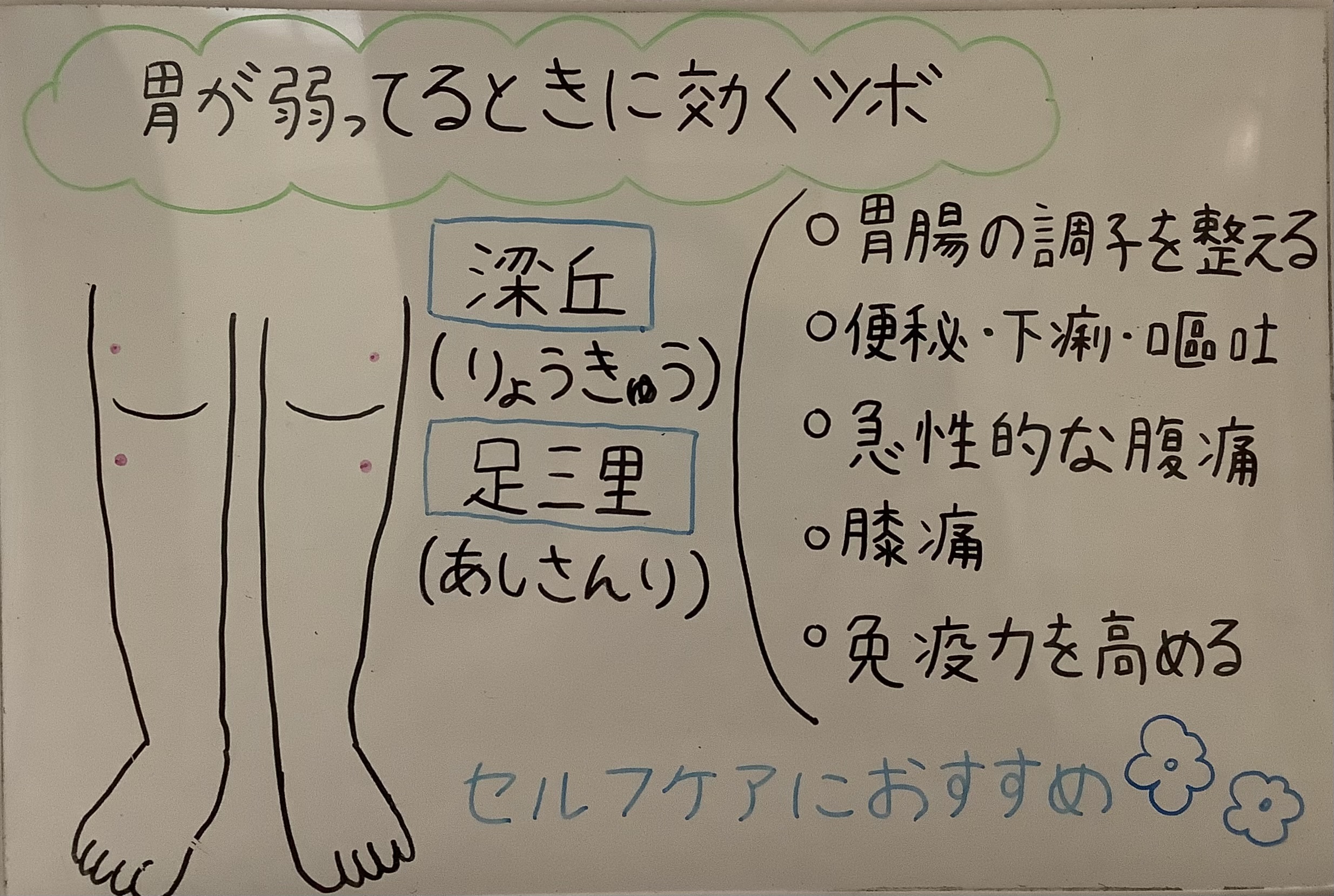 「足三里」へのお灸がおススメですが、心地の良い力加減でご自身の指で指圧してあげてください。