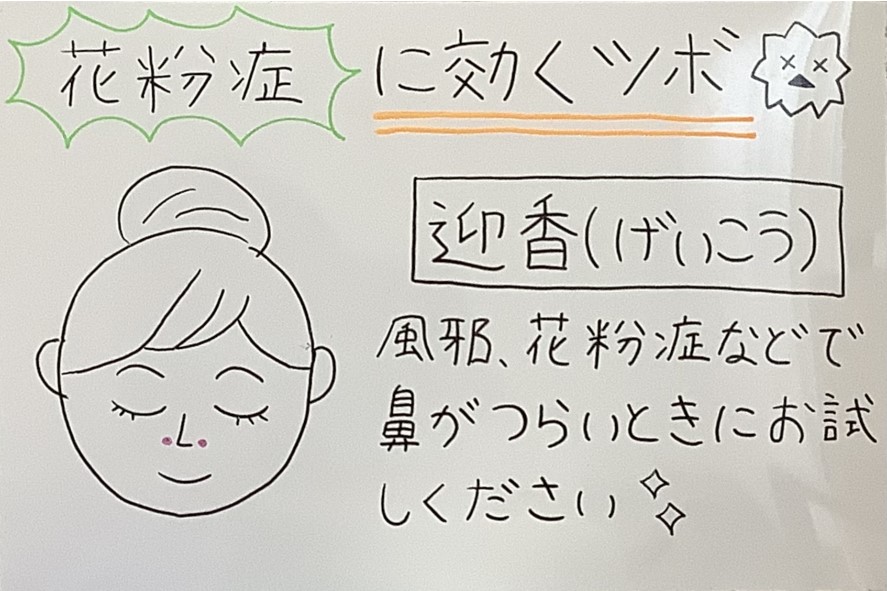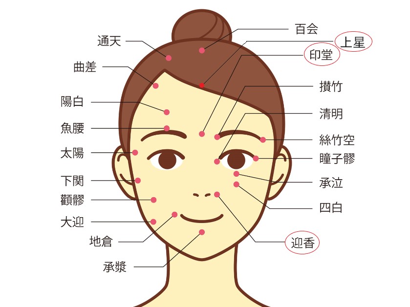 「迎香」は若干外から内へ、「印堂」「上星」は心地の良い場所を指で押してあげてください。
