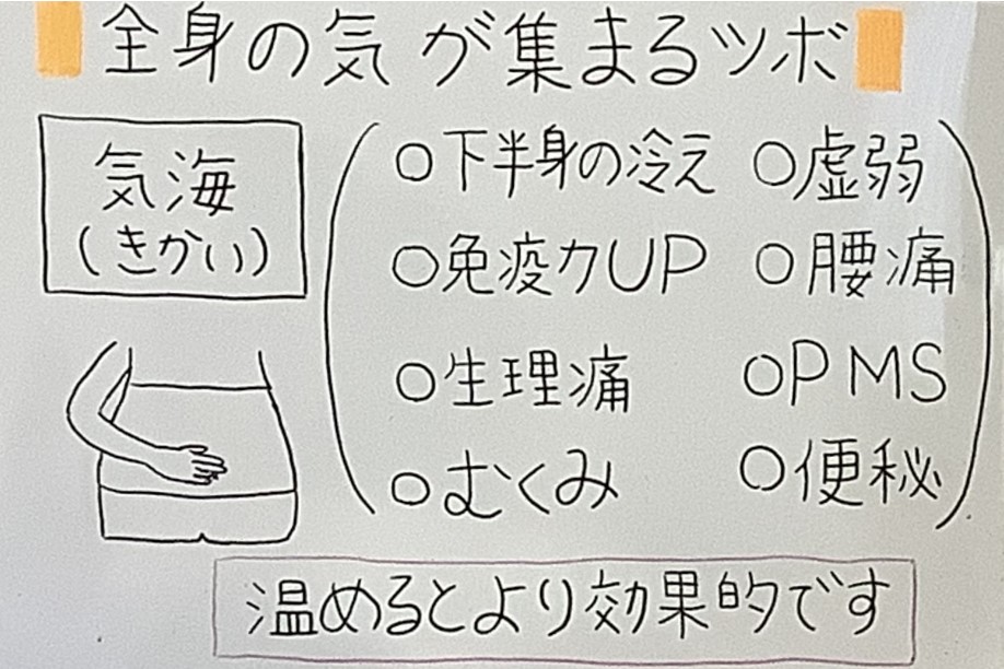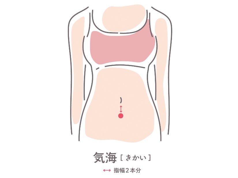 『気海』(きかい)は下丹田とも呼ばれ、おへその少し下に位置し全身の「氣」(エネルギー)が集まる所といわれています。