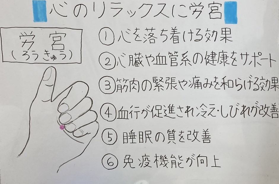 労宮は、心を落ち着ける効果があるとされています。ストレスや不安を軽減し、リラックスするのに役立ちます。