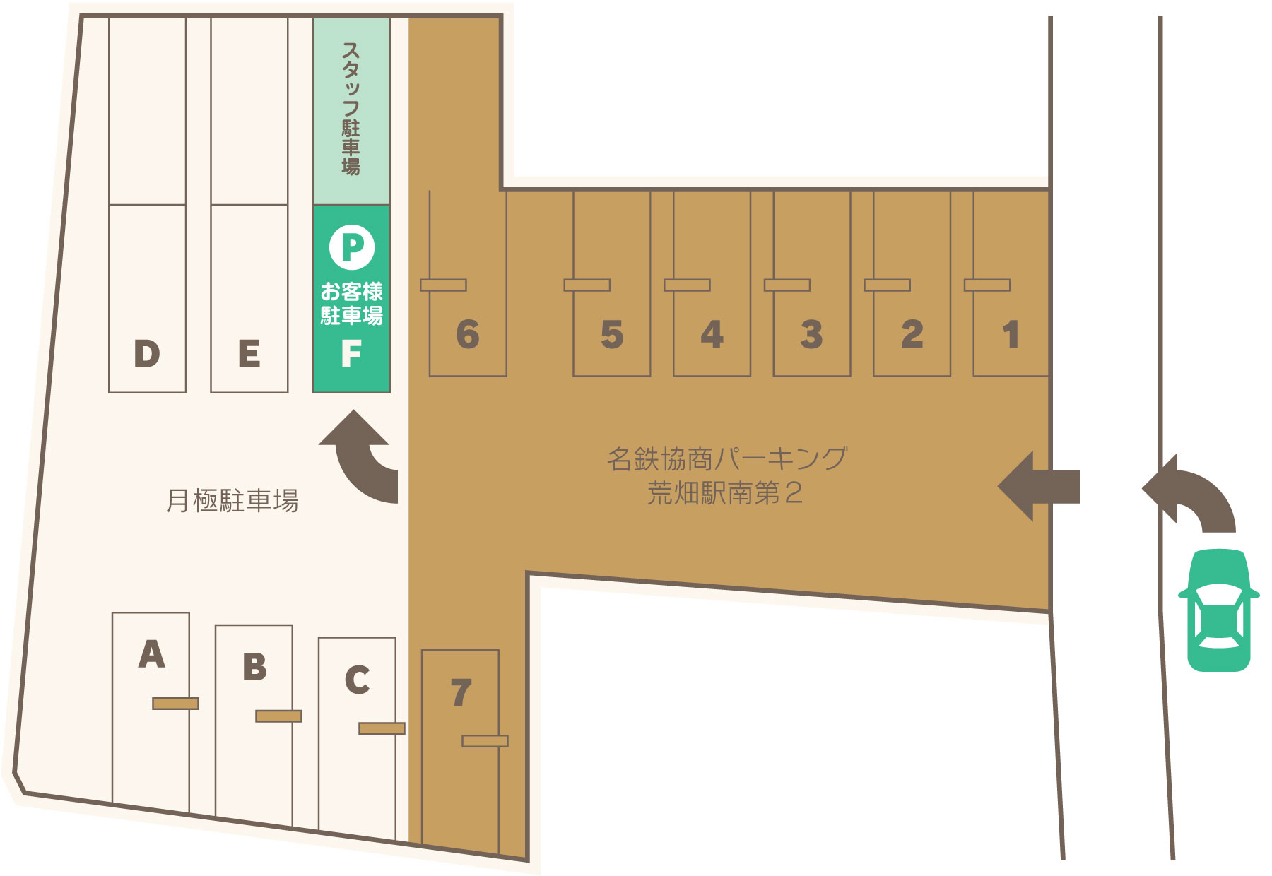 「名鉄協商パーキング荒畑駅南第2」の奥の月極駐車場Ⓕの前列(手前側)にお停めください。