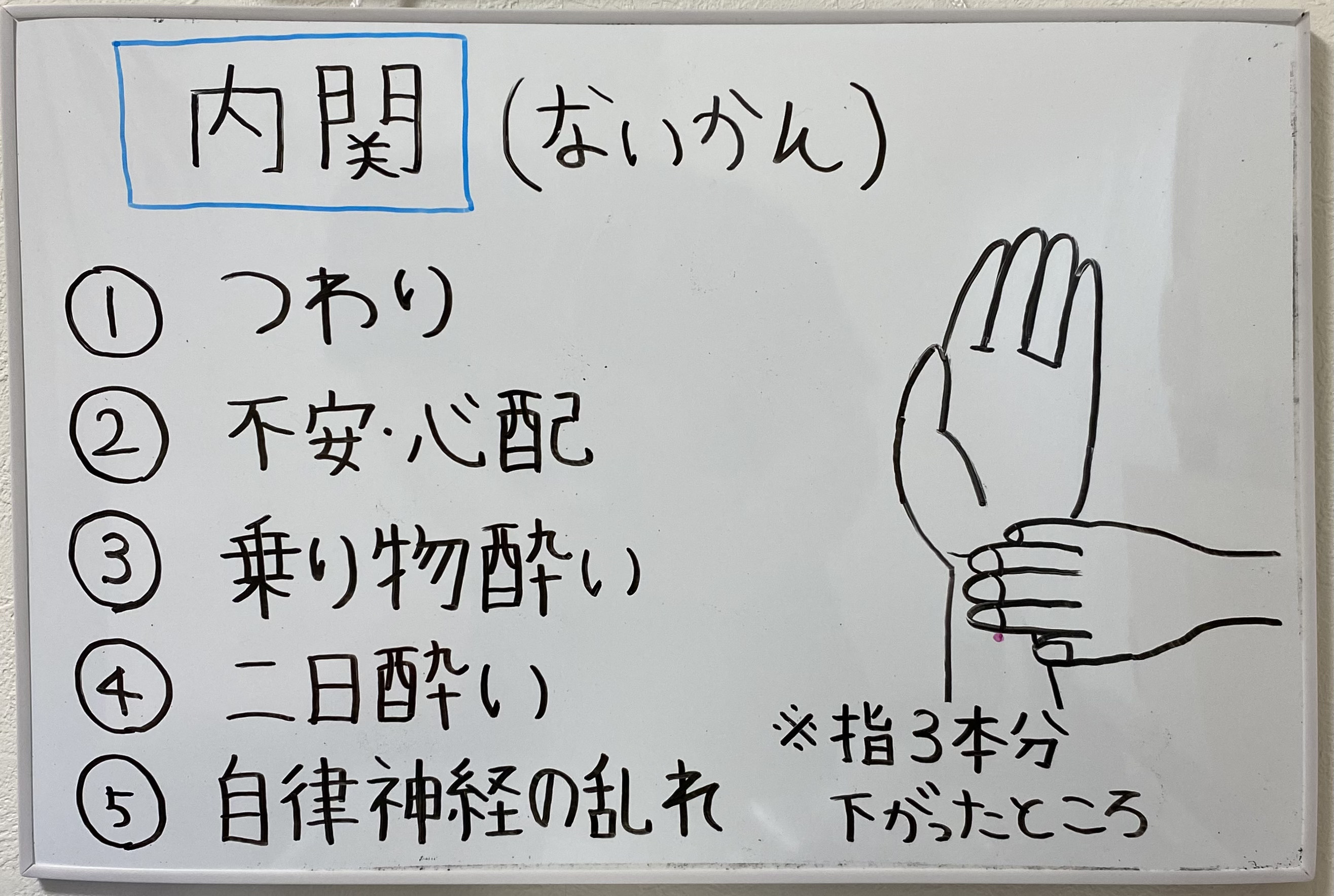 不安や心配事があったりする時も「内関」はリラックス効果もありますので受験やテストを控えた方にもお勧めです。