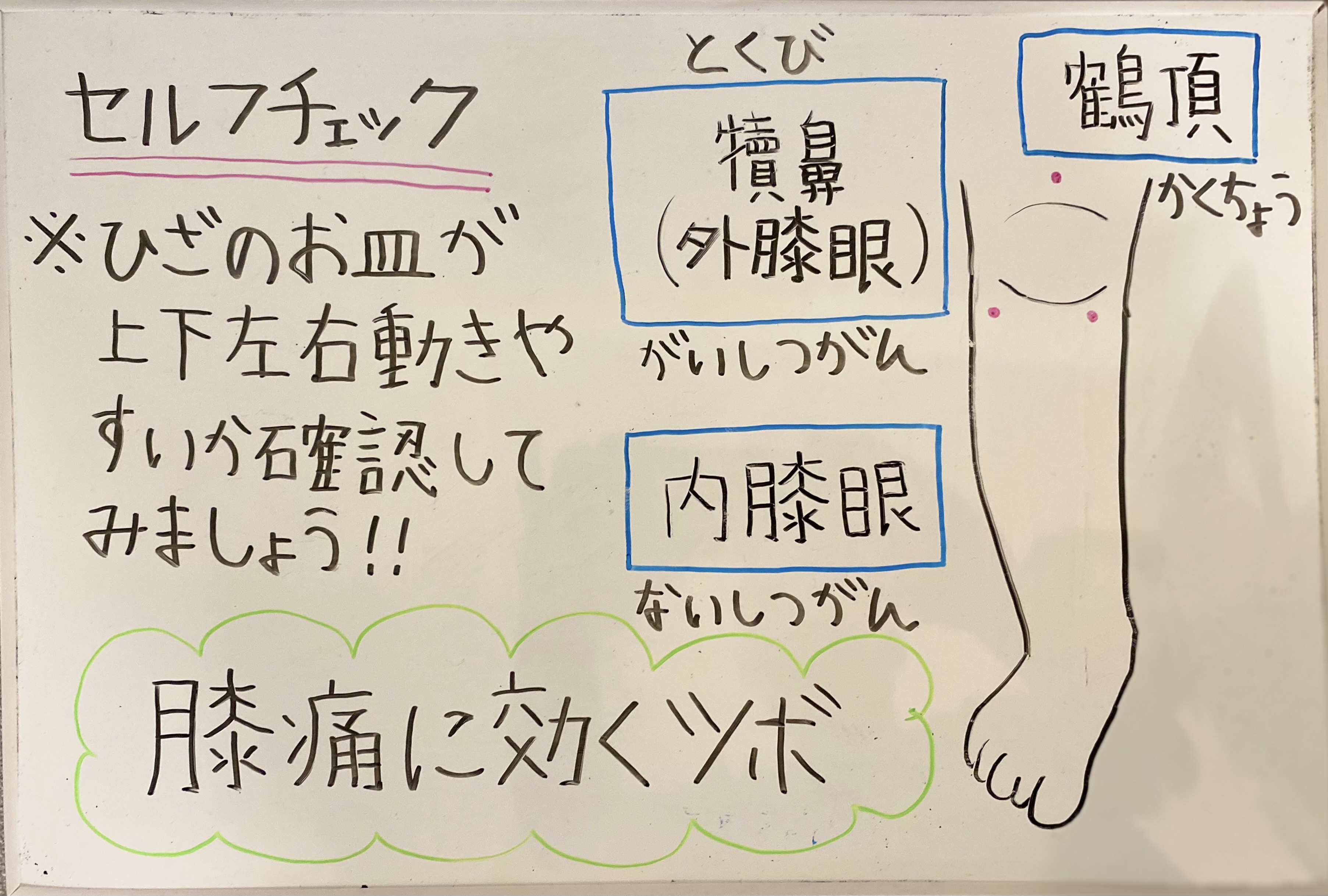 ワンポイントアドバイス:足をまっすぐに伸ばしセルフチェックの時のように膝のお皿を上下左右動かしてあげて、動きを良くしてあげてください。膝のお皿の周りの筋肉が柔らかくなります。力は加減して行ってください。