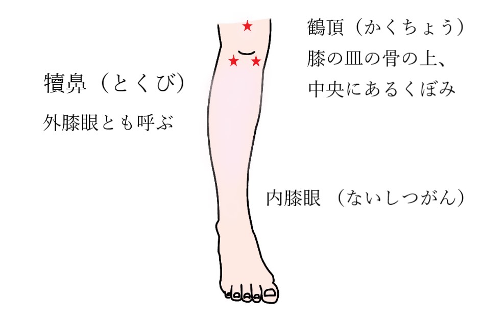 場所:膝の皿(膝蓋骨)の下、外側(犢鼻・外膝眼)と内側(内膝眼)・膝の皿上、中央のくぼみ(鶴頂)