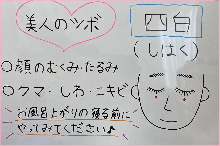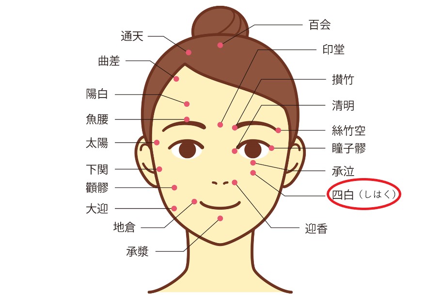 その中でも「四白(しはく)」は、ご自身でケアしやすいツボで、かつ効果が表れやすかったりしますのでセルフケアに大変おススメです。