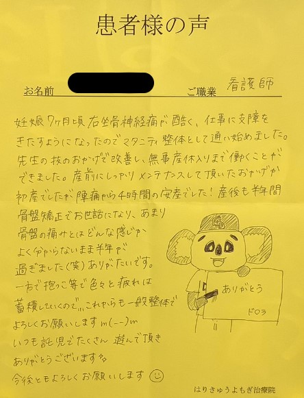 妊娠7ヶ月頃右坐骨神経痛が酷く、仕事に支障をきたすようになったのでマタニティ整体として通い始めました。