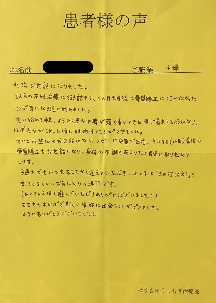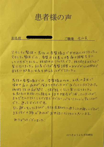 それから臨月まで定期的に通い無事出産し、産後1ヵ月から骨盤矯正でまた定期的に通わせていただきました。