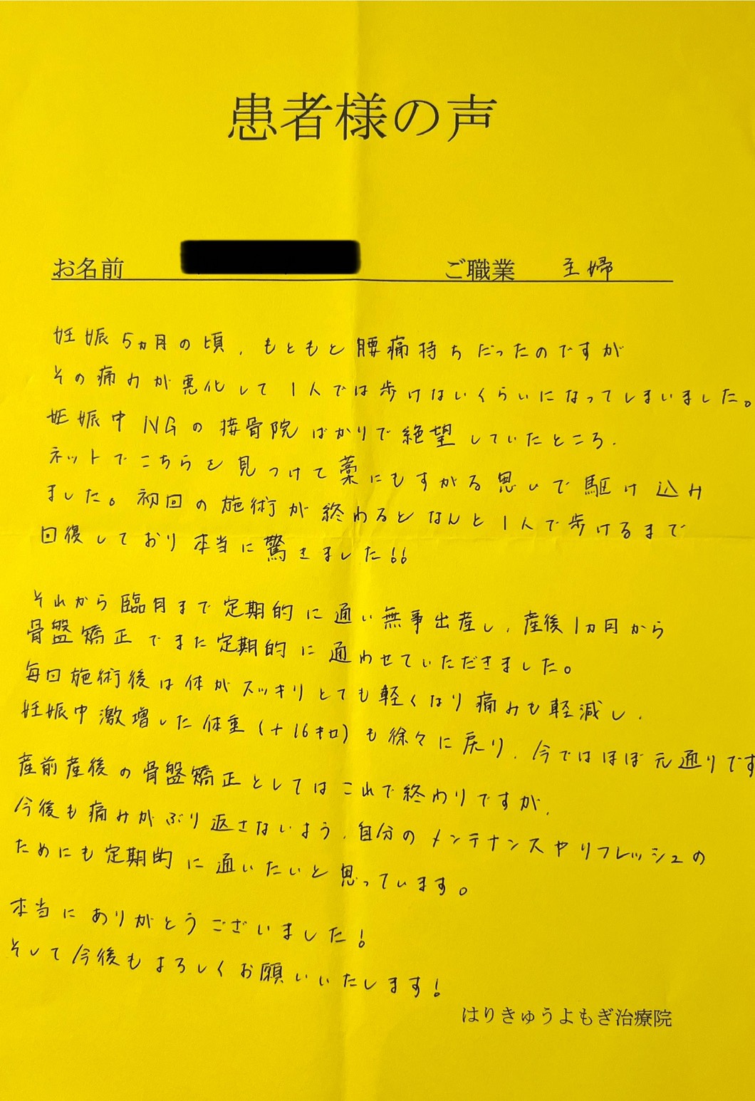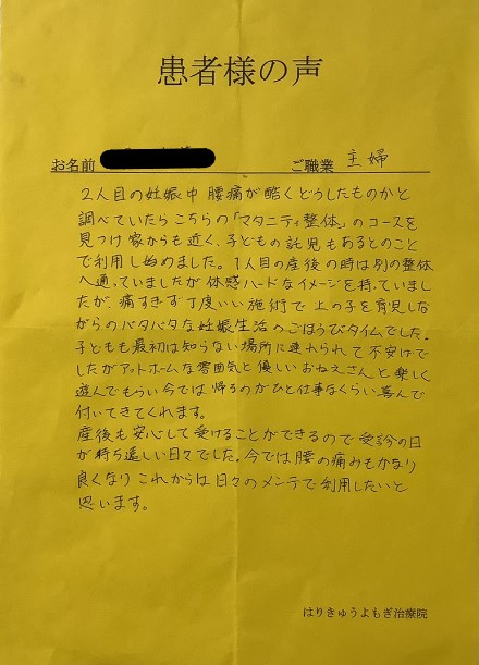 妊娠中NGの接骨院ばかりで絶望していたところ、ネットでこちらを見つけて藁にもすがる思いで駆け込みました。