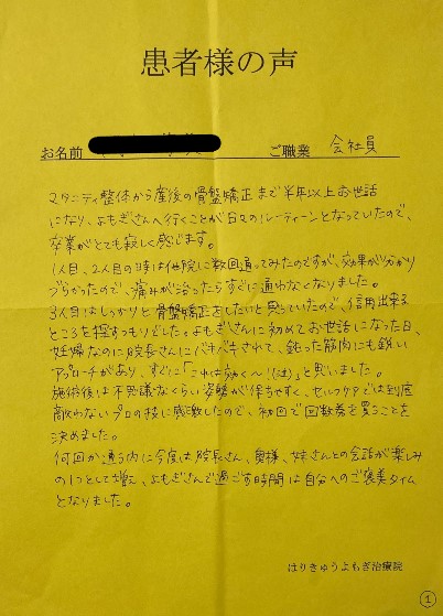 産前産後の骨盤矯正としてはこれで終わりですが、今後も痛みがぶり返さないよう、自分のメンテナンスやリフレッシュのためにも定期的に通いたいと思っています。