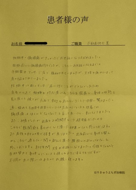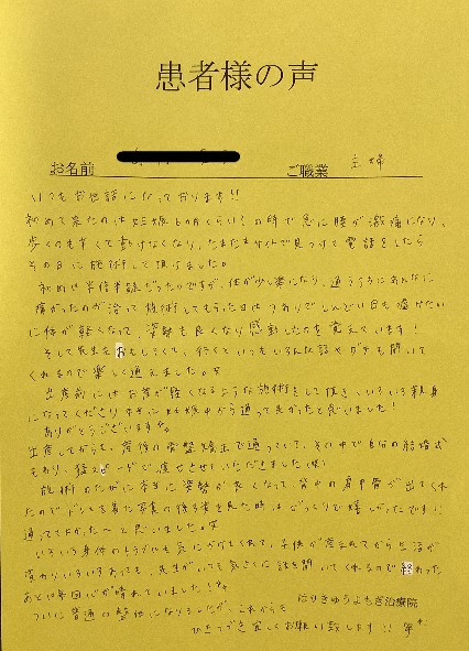 また、施術の際には子育ての悩みをきいて下さったり、子育ての先輩としてのアドバイスを頂きありがとうございました。