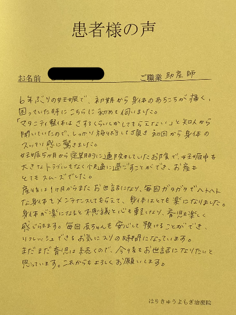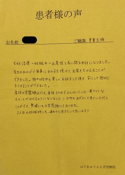 出産前にはお産が軽くなるような施術をして頂き、いろいろ親身になってくださり本当に妊娠中から通って良かったと思いました!