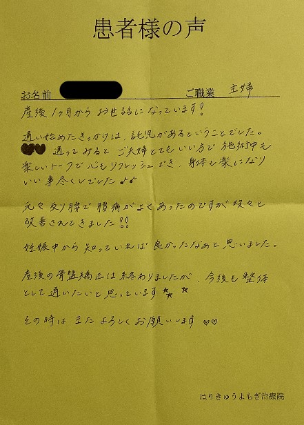 出産1ヶ月後から産後の骨盤矯正に15回通わせてもらいました。