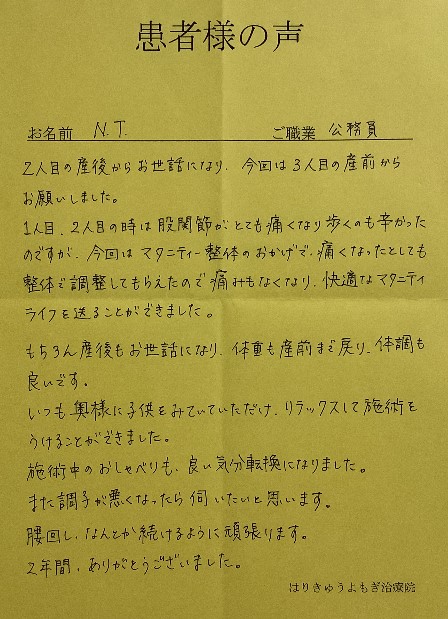 1人目、2人目の時は股関節が、とても痛くなり歩くのも辛かったのですが、今回はマタニティー整体のおかげで、痛くなったとしても整体で調整してもらえたので痛みもなくなり、快適なマタニティライフを送ることができました。