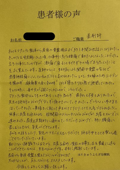 マタニティ整体なんてものがあることも知らず、最初は不安もありましたが、先生の施術のおかげで少しずつ痛みもひいていきました。