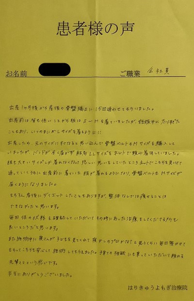 服も大きいサイズしか着れなくなって悲しい思いをしていたところネットでこちらを見つけて通っていくうちに出産前に着ていた服が着れるようになり、骨盤ベルトもMサイズが届くようになりました。