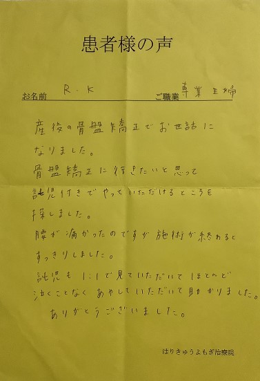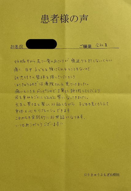 妊娠中から尾てい骨のあたりが寝返りを打てないくらい痛く、日中子どもを預けられるところもないので託児付きの整体を探していたところはりきゅうよもぎ治療院さんを見つけました。