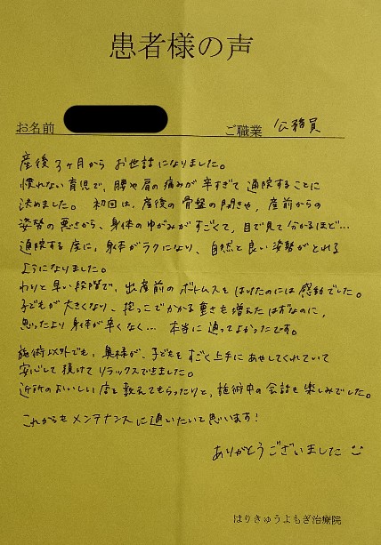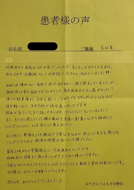 産後も定期的に通わせていただいたおかげで、特に腰痛に苦しむこともなく、育児ができています。