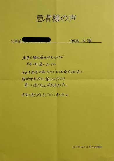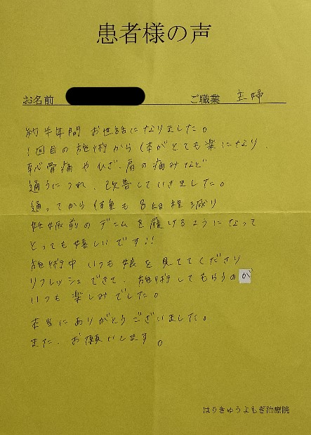 1回目の施術から体がとても楽になり、恥骨痛やひざ、肩の痛みなど通うにつれ、改善していきました。