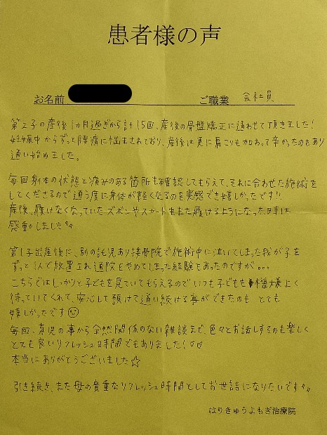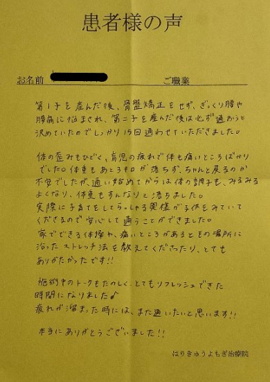 第1子を産んだ後、骨盤矯正をせず、ぎっくり腰や腰痛に悩まされ、第2子を産んだ後は必ず通おうと決めていたのでしっかり15回通わせていただきました。