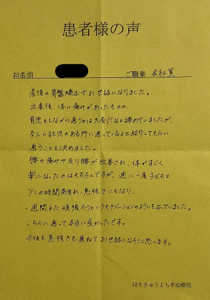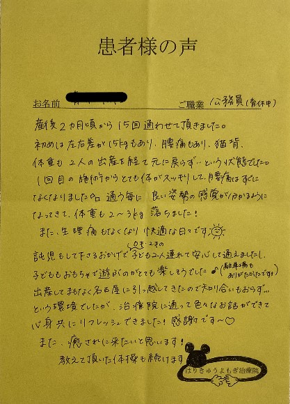 腰の痛みや反り腰が改善され、体がすごく楽になったのはもちろんですが、週に一度子どもと少しの時間離れ、息抜きにもなり、一週間また頑張ろうというモチベーションのようにもなっていました。
