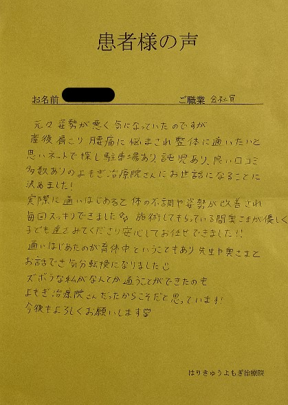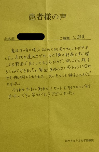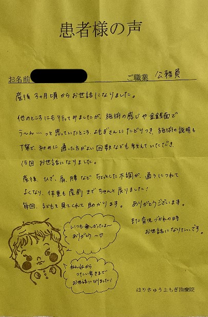 出産してまもなく名古屋に引っ越してきたので知り合いもおらず…という環境でしたが、治療院に通って色々なお話ができて心身共にリフレッシュできました!