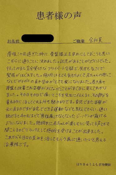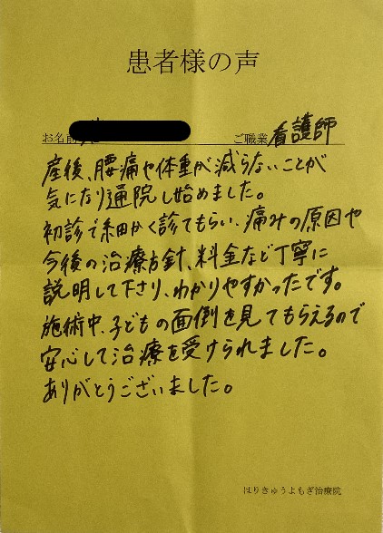 妊娠中からずっと腰痛に悩まされており、産後は更に肩こりも加わって辛かったのもあり通い始めました。