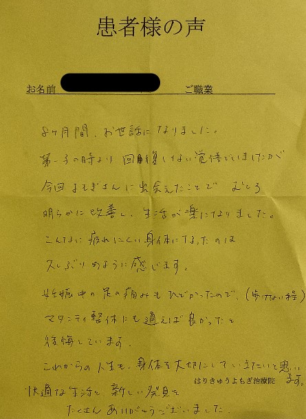 1回目の施術からとても体がスッキリして、腰痛はすぐになくなりました☆彡