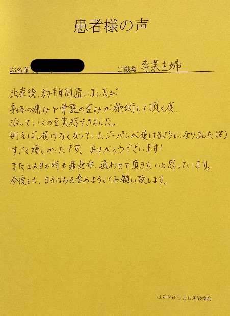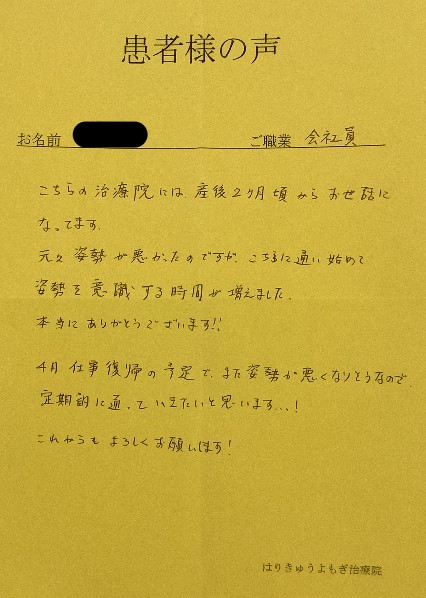 育休復帰も早くと考えていたので、よもぎ治療院さんを選んで本当に良かったです。
