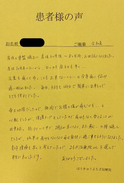 産後の骨盤矯正は終わりましたが、子育てや仕事で姿勢もくずれやすく骨も歪みがちなので、こらからもお世話になりたいです。