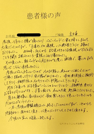 また、施術の際には子育ての悩みをきいて下さったり、子育ての先輩としてのアドバイスを頂きありがとうございました。