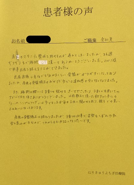 産前のマタニティ整体を始めるのが遅れてしまいましたが、36週ギリギリまで施術して頂いてありがとうございました。