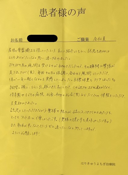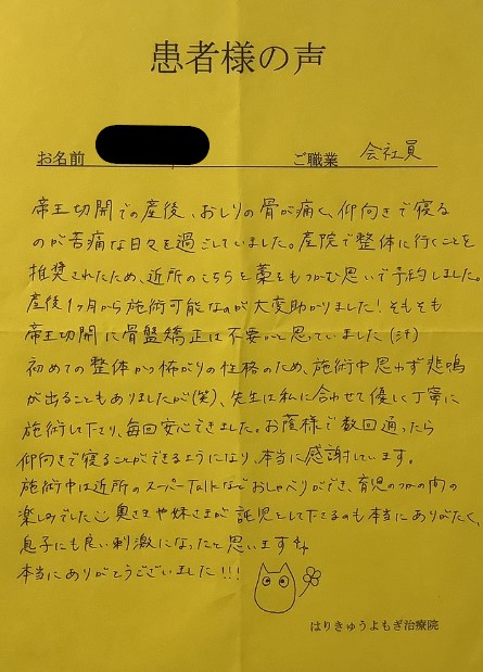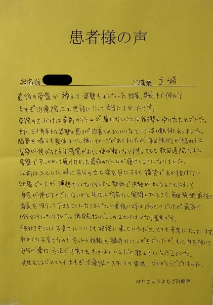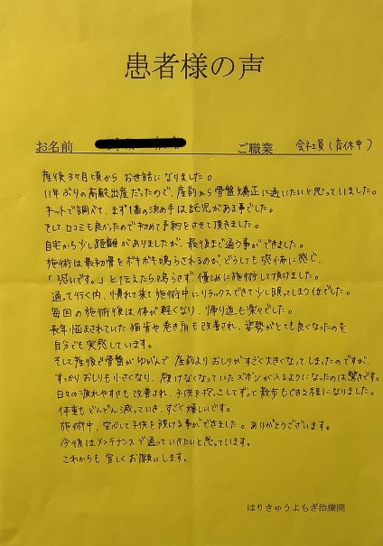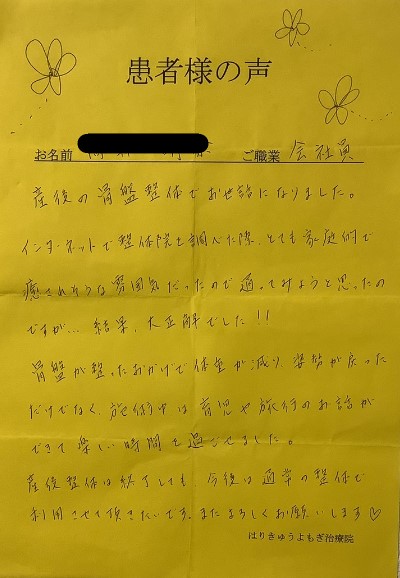 お陰様で数回通ったら仰向きで寝ることができるようになり、本当に感謝しています。