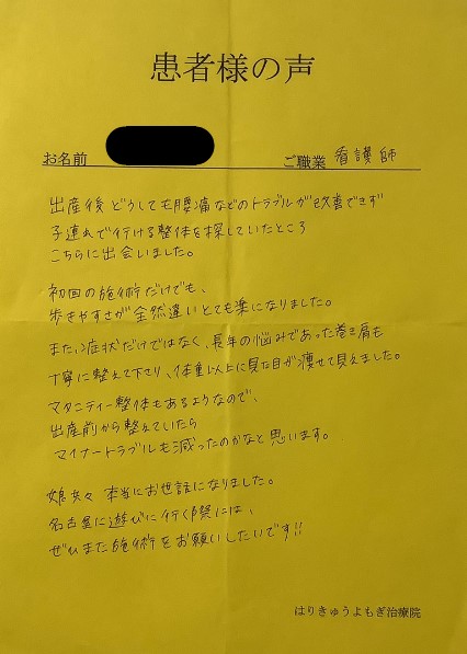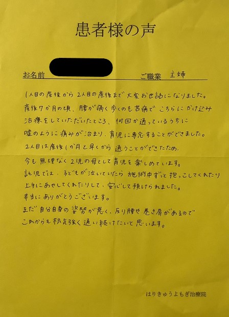 産後、腰痛やひざの痛みに悩んでいましたが、施術して頂くととても楽になりました。