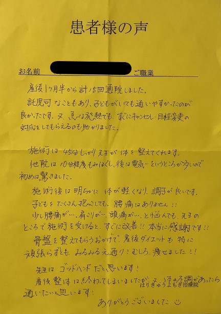 産後の骨盤矯正を探していたところ、こちらのHPを見かけて通い始めました。