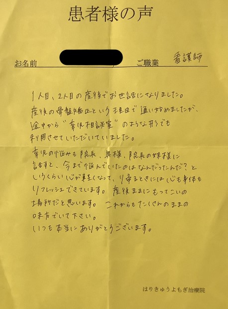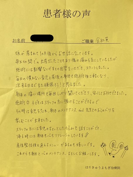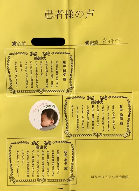 出産後はなかなか身内以外の大人と会話する機会もないので、施術中の院長さんや奥様、妹さんとの会話もとても楽しくストレス発散になっていました。
