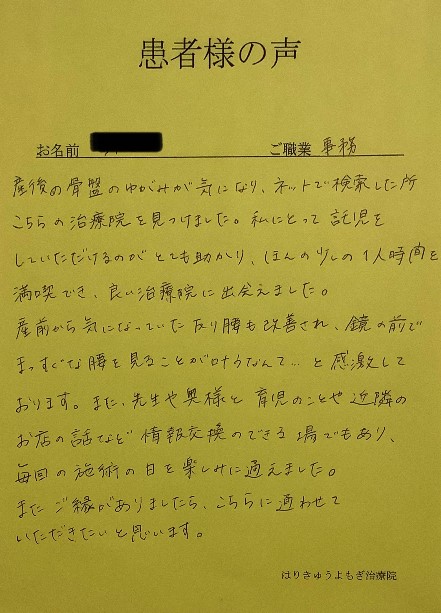 産後の骨盤のゆがみが気になり、ネットで検索した所こちらの治療院を見つけました。