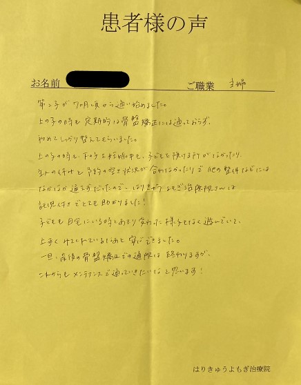 また、先生や奥様と育児のことや近隣のお店の話など情報交換のできる場でもあり、毎回の施術の日を楽しみに通えました。