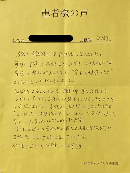 毎回丁寧に施術していただき、帰る頃には育児の疲れがスッキリし、“今日も頑張ろう!!”と活力をいただいていました。