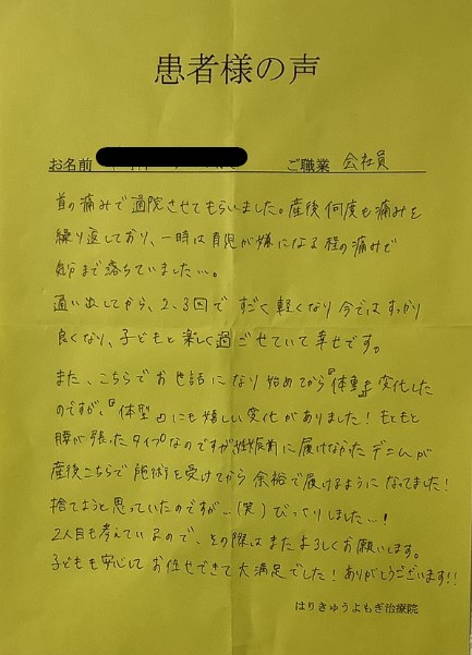 通い出してから、2・3回ですごく軽くなり今ではすっかり良くなり、子どもと楽しく過ごせて幸せです。