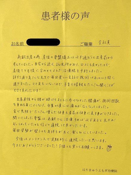 出産直後から腰が砕けてまともに歩けなかった腰痛が、施術回数を重ねる毎によくなり、卒業の頃には痛みがなくなっていました。