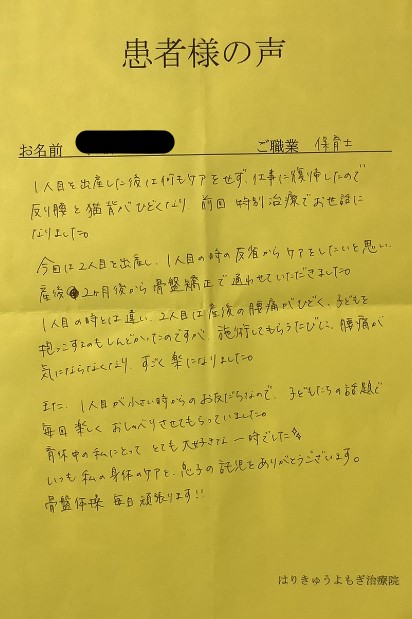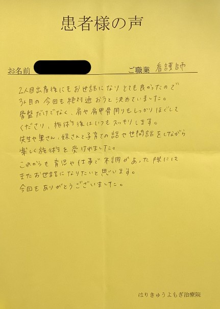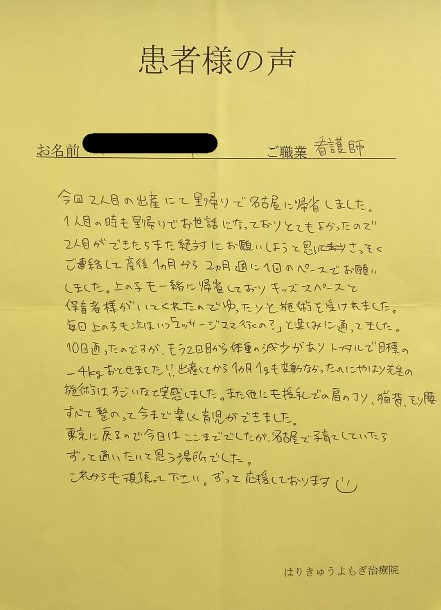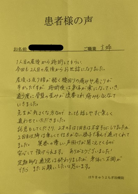1人目のとは違い、2人目の出産の腰痛がひどく、子どもを抱っこするのもしんどかったのですが、施術してもらうたびに、腰痛が気にならなくなり、すごく楽になりました。