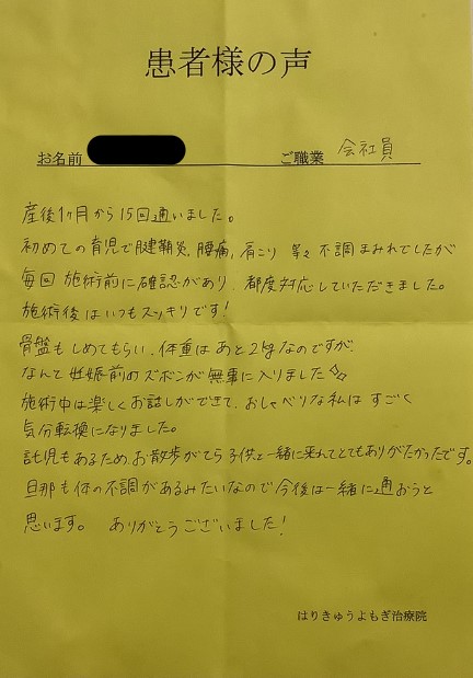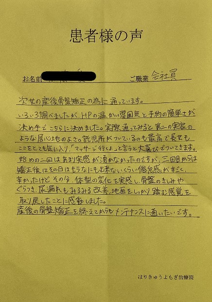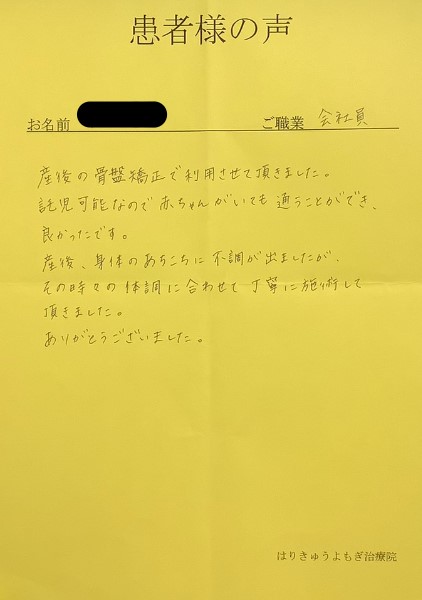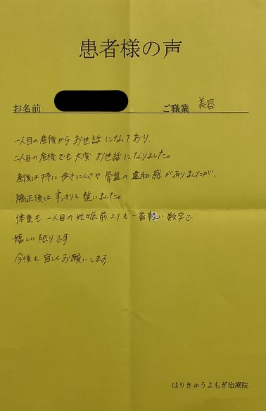 今回は2人目を出産し、1人目の時の反省からケアをしたいと思い、産後2カ月後から骨盤矯正で通わせていただきました。