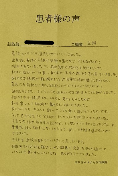 産後、身体のあちこちに不調が出ましたが、その時の体調に合わせて丁寧に施術して頂きました。