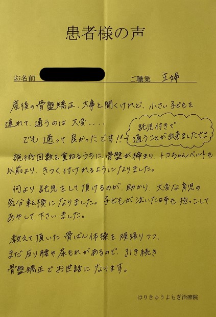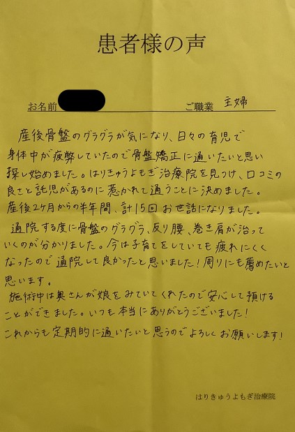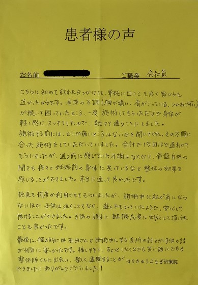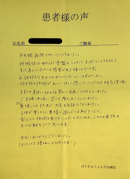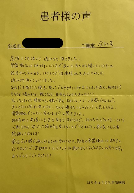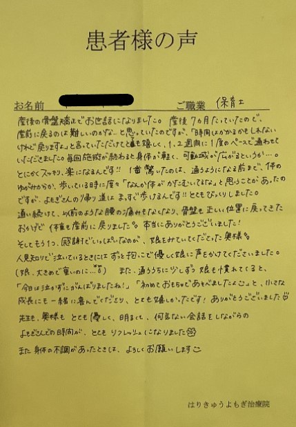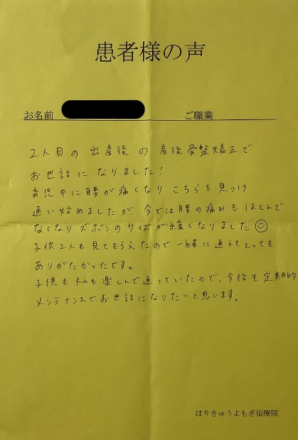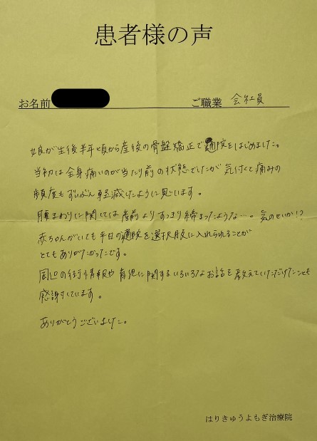 最近では腰が痛くなることも少なくなり、産後の骨盤矯正は終了となりましたが、定期的にメンテナンスに通わせていただきたいと思います。