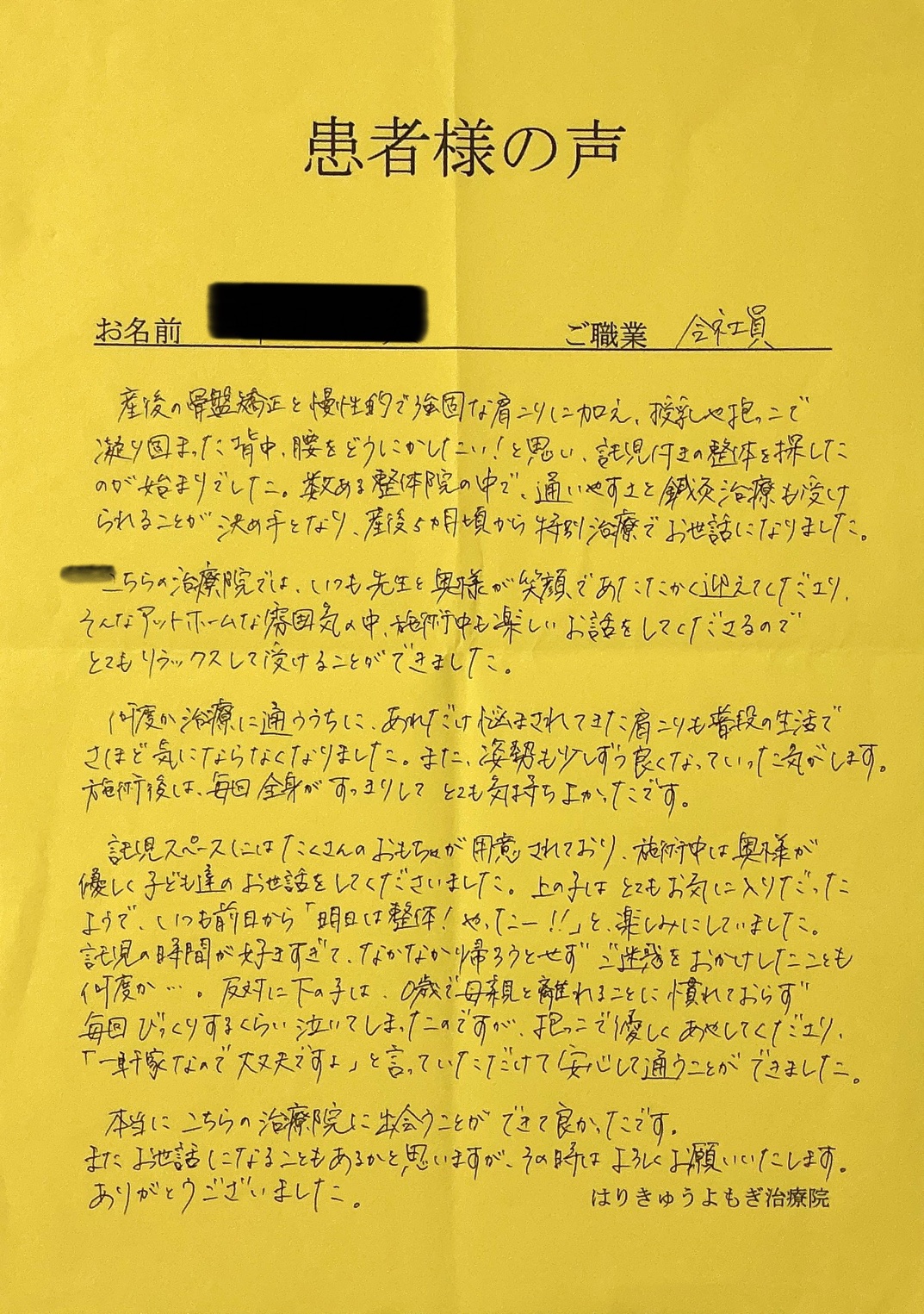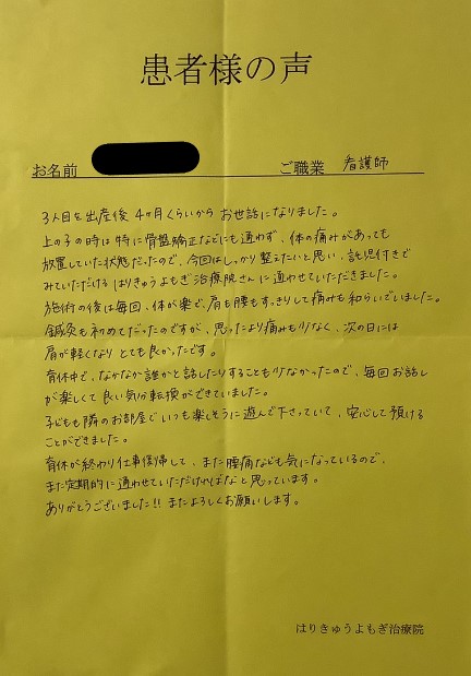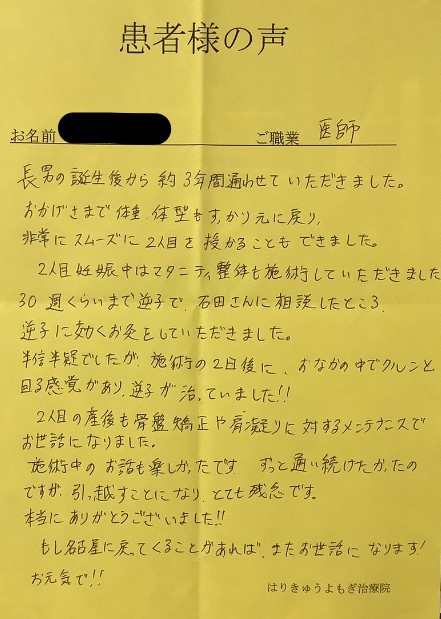育休が終わり仕事復帰して、また腰痛なども気になっているので、また定期的に通わせていただければなと思っています。