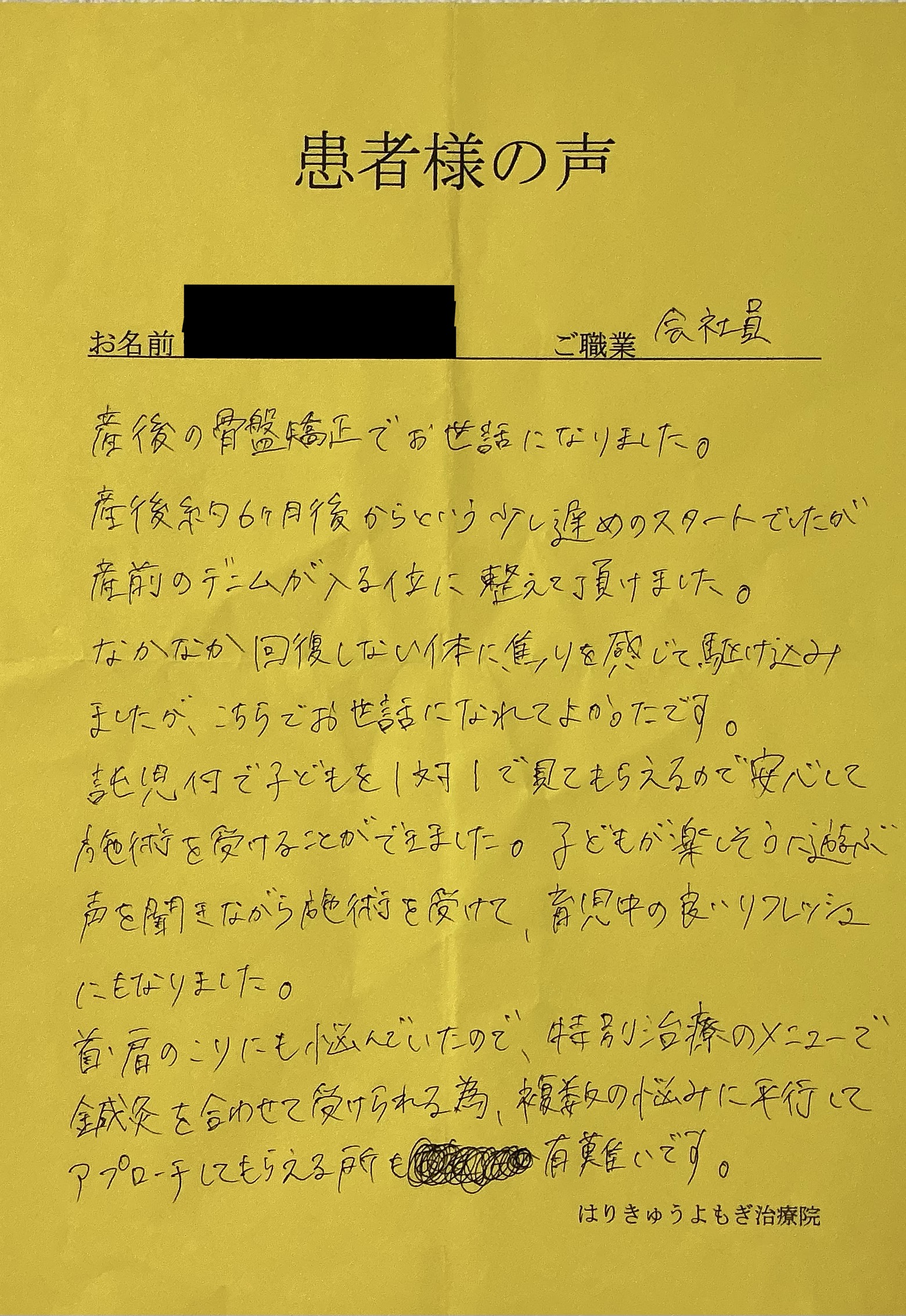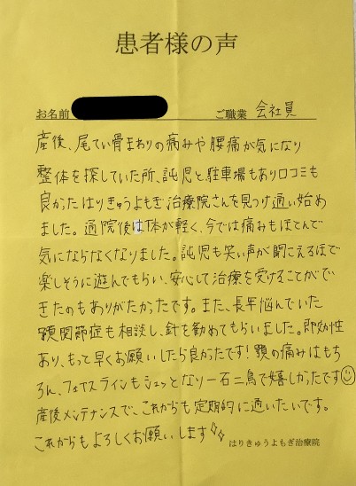 産後、尾てい骨まわりの痛みや腰痛が気になり整体を探していた所、託児と駐車場もあり口コミも良かったはりきゅうよもぎ治療院さんを見つけ通い始めました。