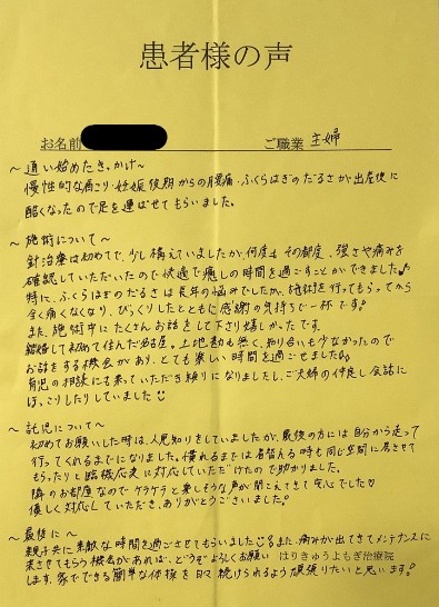 特に、ふくらはぎのだるさは長年の悩みでしたが、施術を行ってもらってから全く痛くなくなり、びっくりしたとともに感謝の気持ちで一杯です!
